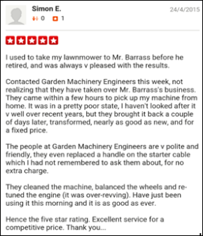 Just a line to let you know how pleased I was with the work you did on my mower and hedge trimmer, Both now cutting really well, and I couldn't believe how you'd made the mower look like new.